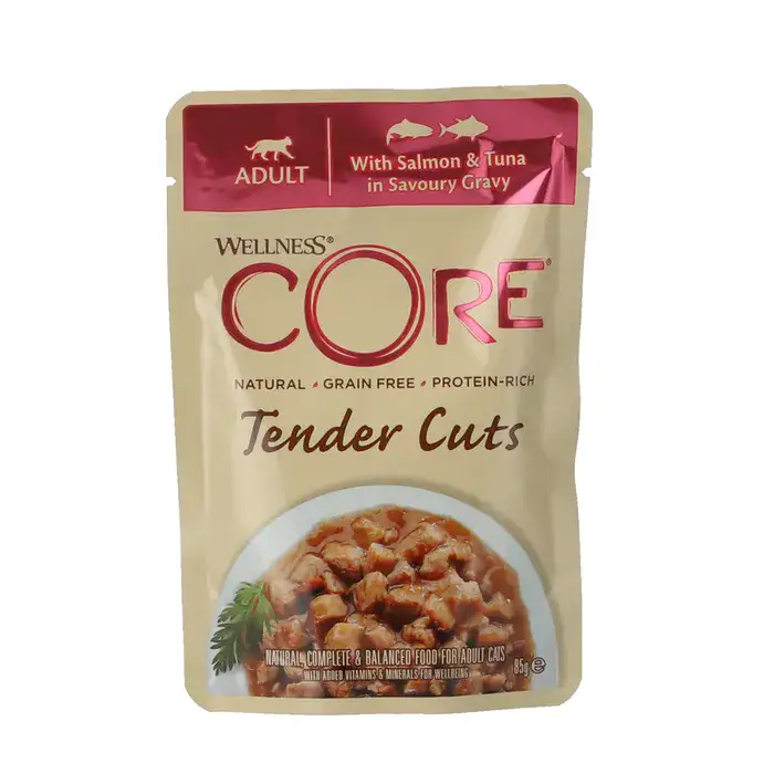 מזון רטוב לחתולים מבית "Wellness CORE" ונקרא "Tender Cuts". פאוץ' וולנס קור הוא מזון מלא עם רוטב עשיר. מדובר במזון טבעי, ללא דגנים, ועשיר בחלבון המיועד לחתולים בוגרים. המוצר מכיל סלמון וטונה ברוטב טעים, ומיועד לספק תזונה מלאה ומאוזנת עם ויטמינים ומינרלים לבריאות החתול.