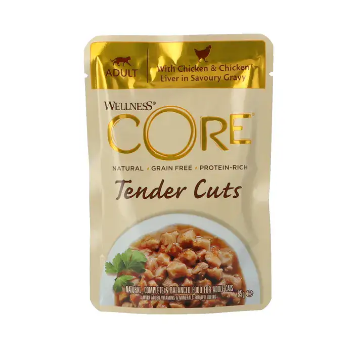מזון רטוב לחתולים מבית "Wellness CORE" ונקרא "Tender Cuts". פאוץ' וולנס קור הוא מזון מלא עם רוטב עשיר. מדובר במזון טבעי, ללא דגנים, ועשיר בחלבון המיועד לחתולים בוגרים. המוצר מכיל עוף וכבד עוף טעים, ומיועד לספק תזונה מלאה ומאוזנת עם ויטמינים ומינרלים לבריאות החתול.