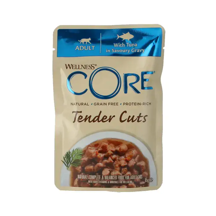 מזון רטוב לחתולים מבית "Wellness CORE" ונקרא "Tender Cuts". פאוץ' וולנס קור הוא מזון מלא עם רוטב עשיר. מדובר במזון טבעי, ללא דגנים, ועשיר בחלבון המיועד לחתולים בוגרים. המוצר מכיל טונה ברוטב טעים, ומיועד לספק תזונה מלאה ומאוזנת עם ויטמינים ומינרלים לבריאות החתול.