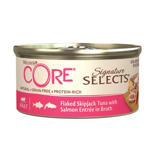 שימור וולנס קור נתחי טונה וסלמון ברוטב לחתולים בוגרים 79 גרם Wellness CORE