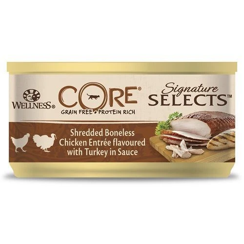 שימור וולנס קור נתחי פילה עוף, כבד והודו ברוטב לחתולים בוגרים 79 גרם Wellness CORE